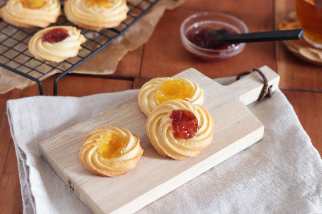 キラキラとしたジャムがかわいいジャムクッキーがバターなし&米粉で作れます。