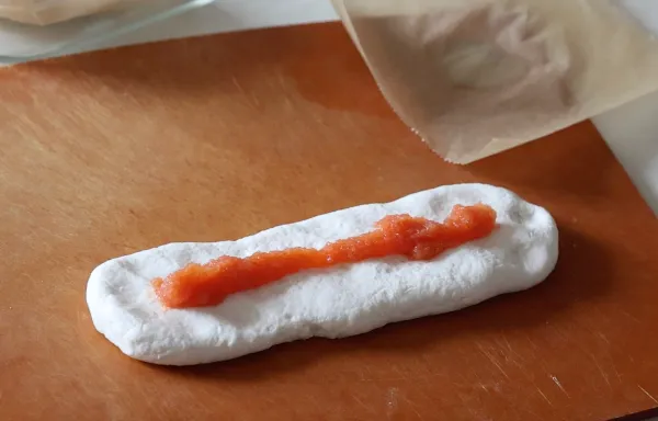17cmほどの長さに細長く伸ばし、潰して中央に棒状になるように明太子をおく。包むように閉じて丸くして、端を止める。