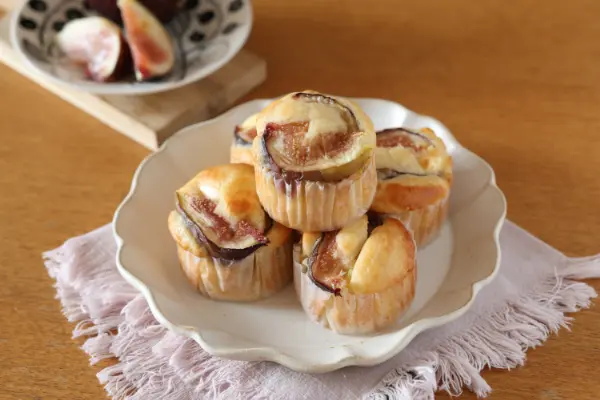 マフィンカップに生地を流し、クリームチーズといちじくをのせて180度のオーブンで20〜23分焼く。
