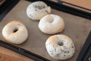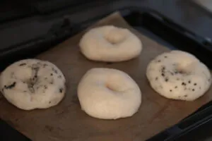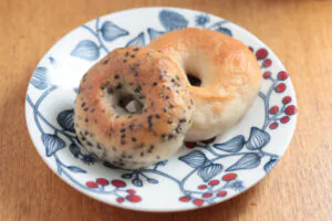 2個を黒ごまベーグルにする場合は2個プレーンの生地をとった後で黒ごま大さじ1を入れて混ぜる。
