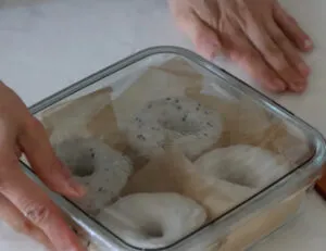なるべく早く焼く場合はオーブンの発酵機能35℃で20分発行させて作り方7に進む。