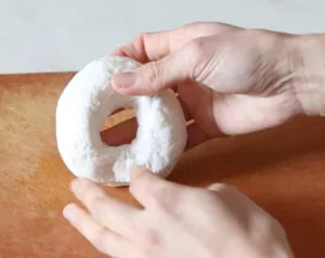 17cmほどの長さに細長く伸ばし、丸く形を整えて片側の端を潰す。もう片側の端をのせ、下にある生地で包む。形を整えて小さく切ったオーブンシートにのせる。