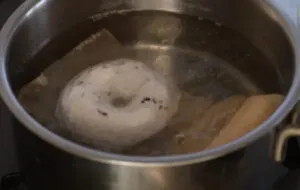 沸騰したお湯にはちみつを加え、6を片面1分30秒、裏返して反対も1分30秒茹でる。