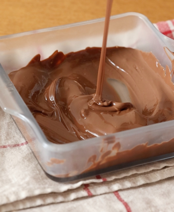チョコレートは細かく刻んで耐熱容器に入れる。電子レンジ(600w)で1分加熱して混ぜて溶かす。