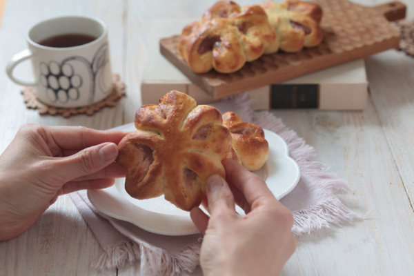 今回は卵と豆乳を使った生地で、しっとりやわらかな食感に仕上げました。あんこが見えるお花の形がポイントです!