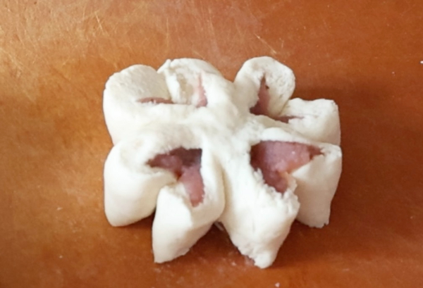 手のひらで直径10cmほどに伸ばし、さくらあん30gを中央に置いて包む。