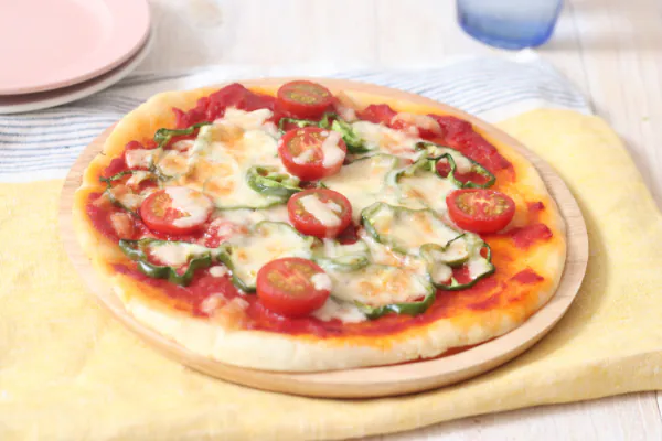 めん棒を使わなくても柔らかい生地なので手で伸ばせます♪ - 生地の表面に米油を薄く塗ってからトマトソースを全体に伸ばし、ピーマン、ピザ用チーズをのせてオーブンで200度15分焼く。