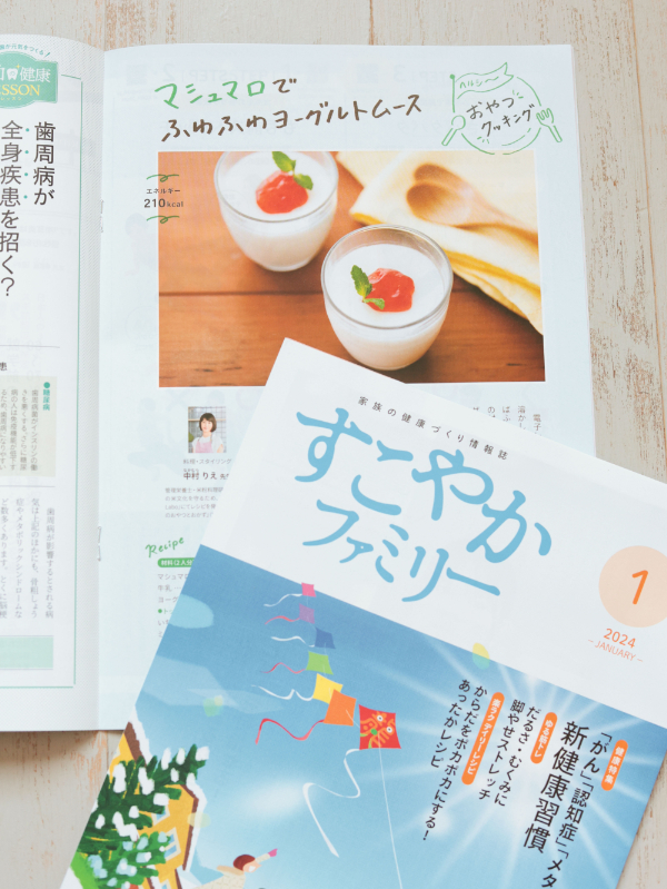 健保組合冊子すこやかファミリーの2023年度のヘルシースイーツコーナーを担当しています。