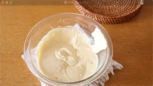 1に米粉を入れて混ぜ、なめらかになったらベーキングパウダーを加えて混ぜる。