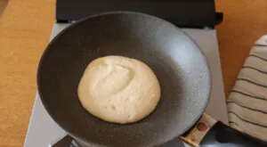 生地を入れてやや弱めの中火で表面のフチが乾いて小さい気泡が出るまで焼く。